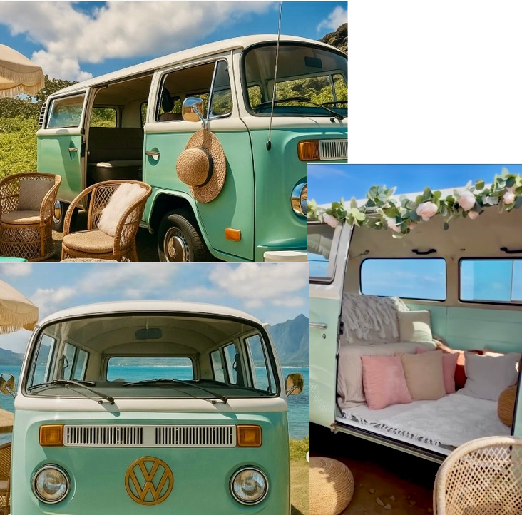 This classic 1978 Volkswagen Bus is ready to roll into your hearts and create the most unforgettable vow renewal or wedding day experience. Restored with vintage charm and island style, it’s the perfect ride for the two of you to celebrate your love in a retro flashback — just the two of you, wrapped in the warm spirit of aloha.